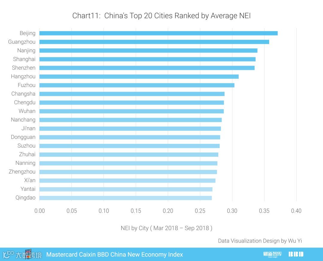 Chart 11 showed the average NEI city rankings between March 2018 and September 2018. The top five cities were Beijing, Guangzhou, Nanjing, Shanghai and Shenzhen.