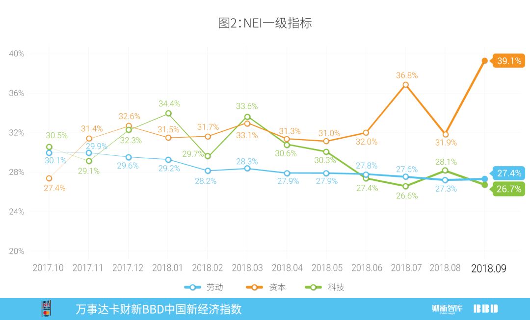 2018年9月,万事达卡财新BBD中国新经济指数(NEI)录得31.3,即新经济投入占整个经济投入的比重为31.3%。2017年以来,NEI指数波动较大,按可比口径计算,本月NEI比上月上升2.2个百分点(图1)。本月NEI的上升主要来自资本投入的回升。