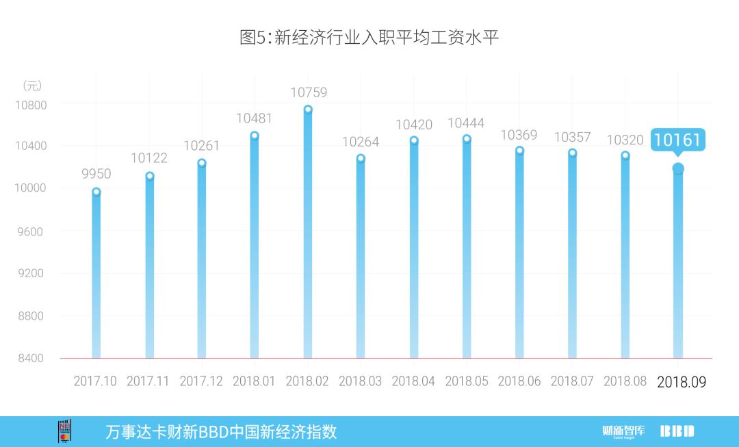 2018年9月,新经济行业入职平均工资水平环比下降,为每月10161元,较上月下降159元(图5)。新经济工资主要来自51job、智联招聘、拉钩、赶集网等数个招聘网站的招聘信息,即对劳动力的需求工资。