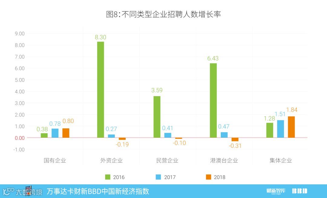 报告比较不同类型企业的招聘人数增长率发现:2016到2018年,国有企业、集体企业招聘人数增速保持稳定并且逐渐上升,但是外资企业、港澳台企业和民营企业招聘人数增速则显著下降, 2016年后三类企业增速较快,2017年增速趋近于零,2018年则出现下降。
