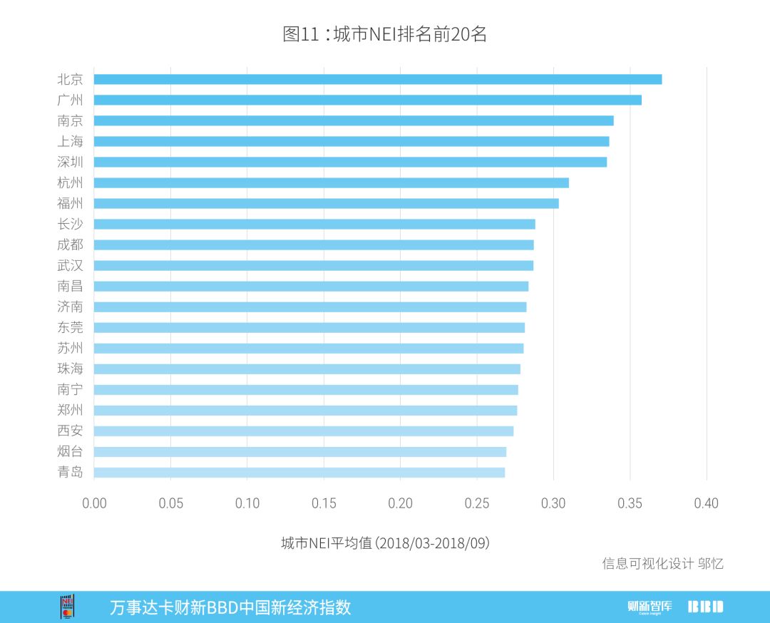 图11计算了2018年3月到2018年9月城市NEI平均排名,前五名为北京、广州、南京、上海、深圳。