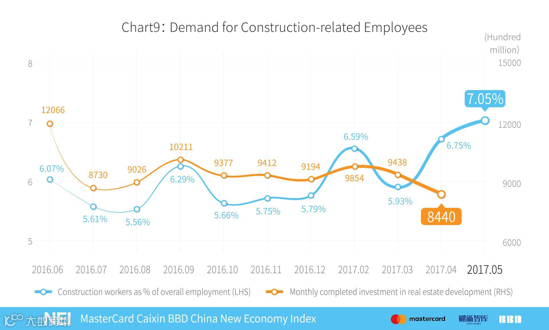 在上个月,我们曾经使用劳动力大数据对目前的投资进行分析。本月,我们重复这套预测方案——使用中国每月的房地产开发投资完成额当月值与劳动力数据建筑类就业人员的需求占比进行比较。可以看到,在2017年4月之前,两者大数据中的劳动占比和房地产开发投资完成额当月值在走势完全一致。然而,建筑类劳动人员的需求在2017年4月已经达到了6.75%,比2017年3月的5.93%上升了0.82%,然而当月的房地产开发投资完成额却比2017年3月下降了10.6%。这是该指标与统计实际值头一次出现背离。