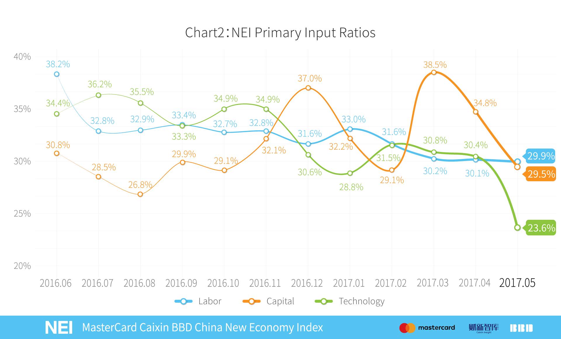 主要在资本投入和科技投入快速回落的带动下,5月万事达卡财新BBD中国新经济指数(NEI)继续下降。