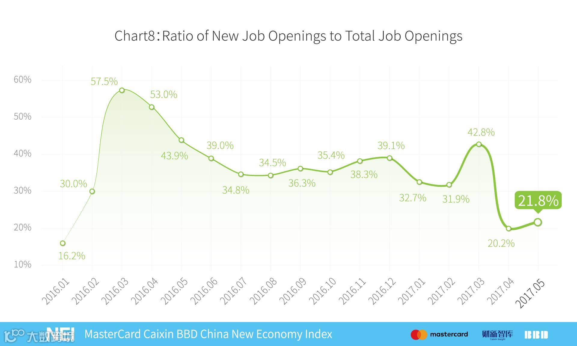 从图8可以看到,在总招聘数据中,“新岗位”数量所占比重从2016年1月开始快速上升,在2016年3月达到顶峰,当月约60%的招聘都是“新岗位”招聘。该比例在2017年4月和5月仍然维持在40%以上,随后开始下降。从2016年7月开始,“新岗位”的比例稳定在35%到40%左右。