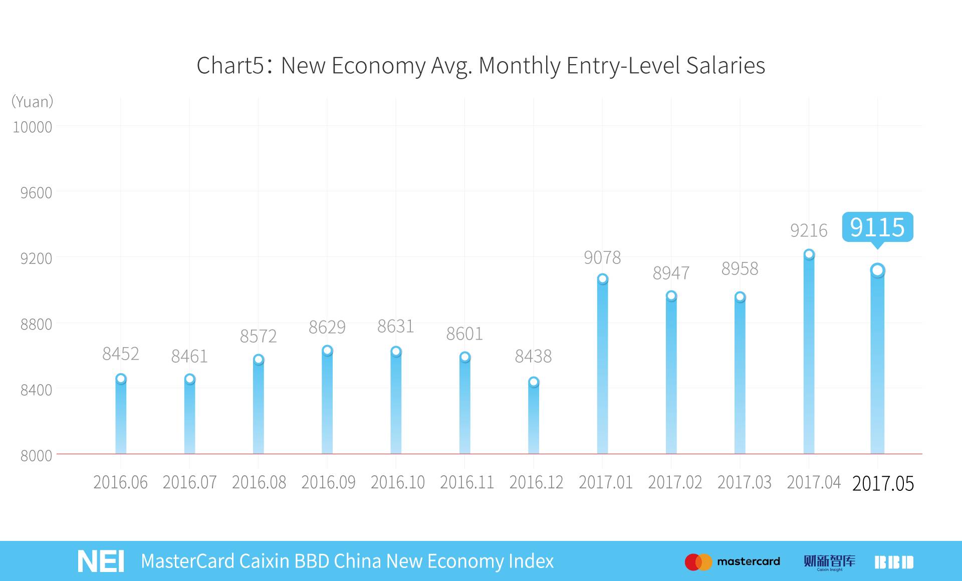 In May 2017, the average monthly entry level salary of the New Economy was RMB 9,115 per month, dropping slightly from last month’s level of RMB 9,216 (Chart 5). New Economy wage information is compiled from online websites of career platforms and recruitment services including 51job and Zhaopin, as well as other sites that list job demands.
