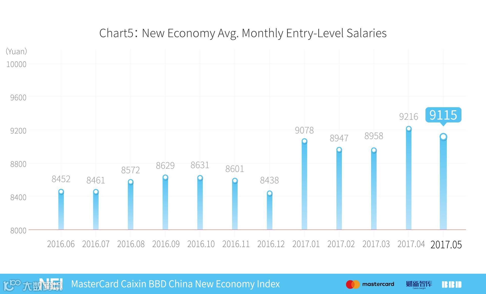 2017年5月,新经济行业入职平均工资水平与上月基本持平,为每月9115元,上月为9216元(图5)。新经济工资主要来自51job、智联招聘、拉钩、赶集网等数个招聘网站的招聘信息,即对劳动力的需求工资。