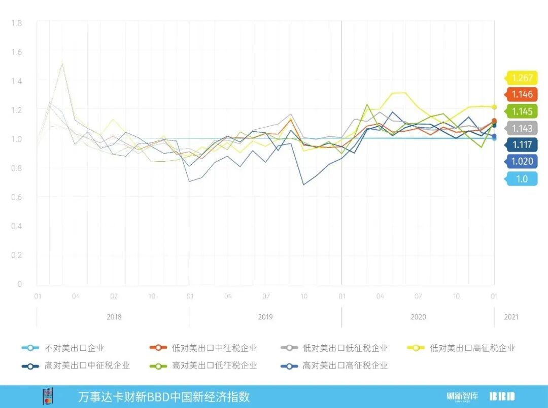 报告发现,在中美贸易摩擦后,原本大部分对美出口企业招聘总量的同比走势都在1以下,即增长幅度慢于不对美出口的企业,但在2020年疫情开始后,这部分企业的招聘增长幅度开始超过不对美出口的企业,尤其是低对美出口高征税企业,其在2020年的招聘总量增幅比不对美出口企业高出30%左右。“全球疫情对中国出口企业尤其是对美出口企业出口的促进,在一定程度上抵消了贸易摩擦的负面效应。”报告称。