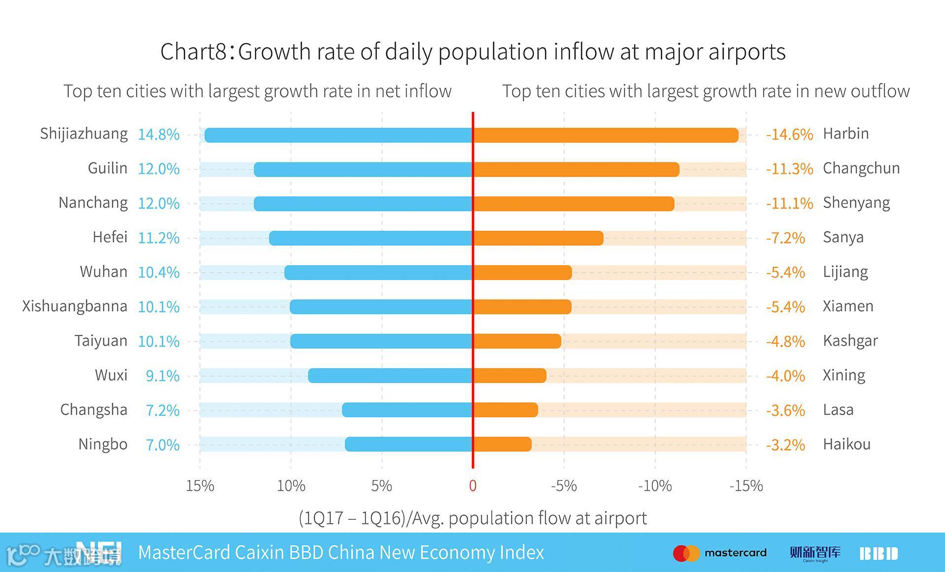 Based on our analysis, cities with the largest net inflows are Beijing, Wuhan ,Chengdu, Guangzhou, and Changsha. Among them, Beijing ranked the first, which seemed inconsistent with the low level of 0.1% growth in Beijing resident population in 2016. However, in 2016, both the growth rates of water consumption and residential electricity consumption in Beijing reached new highs since 2010, which is consistent with the airport traffic data.