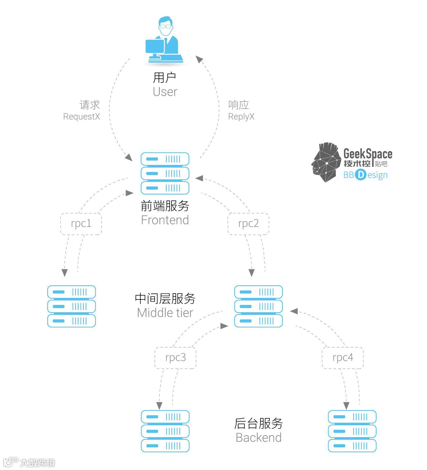 举个例子来说明。用户发起一次请求,这个请求会先到一个前端服务A,再发送两次RPC到中间层服务B和C,B会马上做出反应,但是C需要和后端的D和E交互后再返回给A,由A来响应最初的请求。
