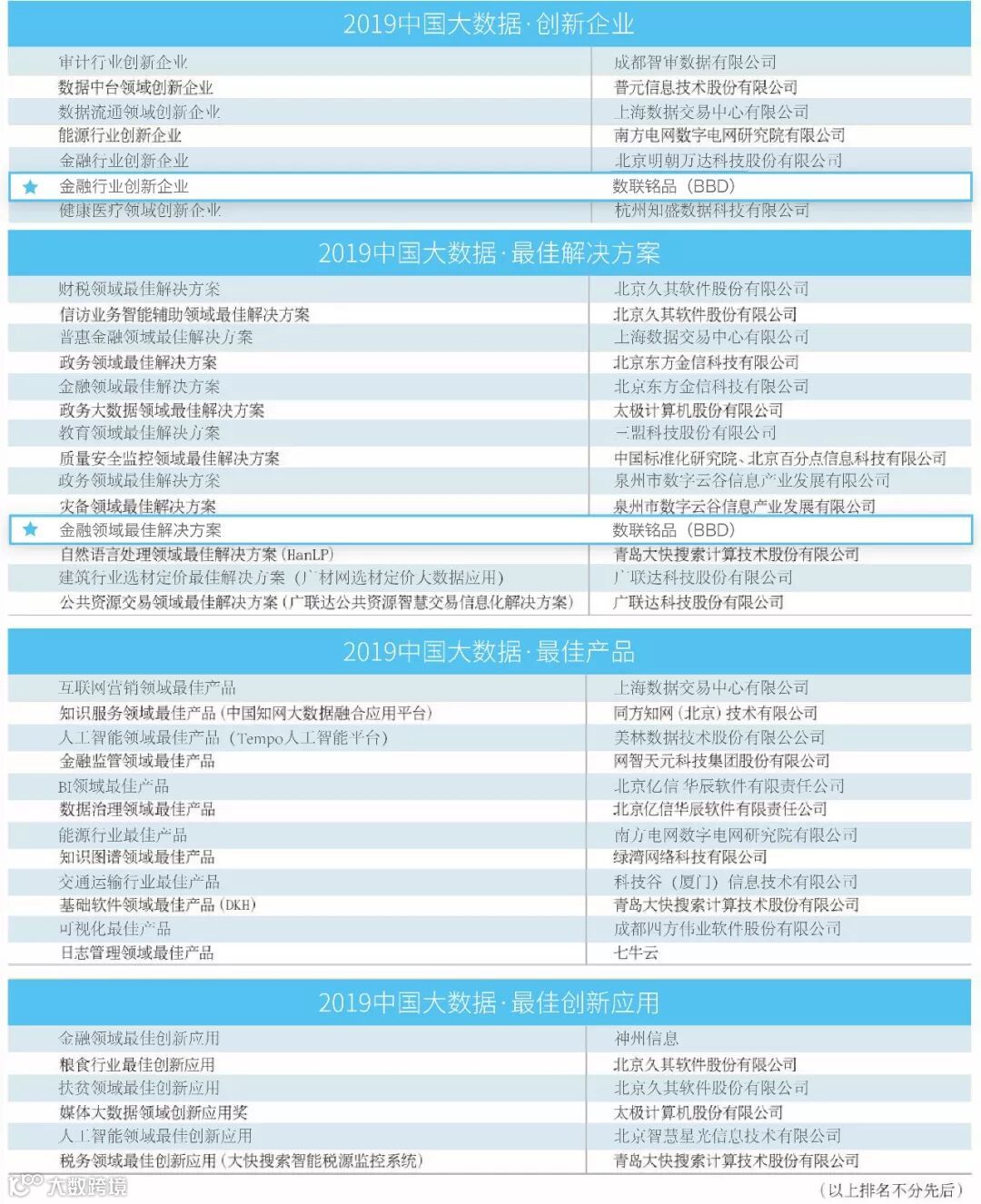 同时,BBD入选2019中国大数据·创新企业和2019中国大数据·最佳解决方案。