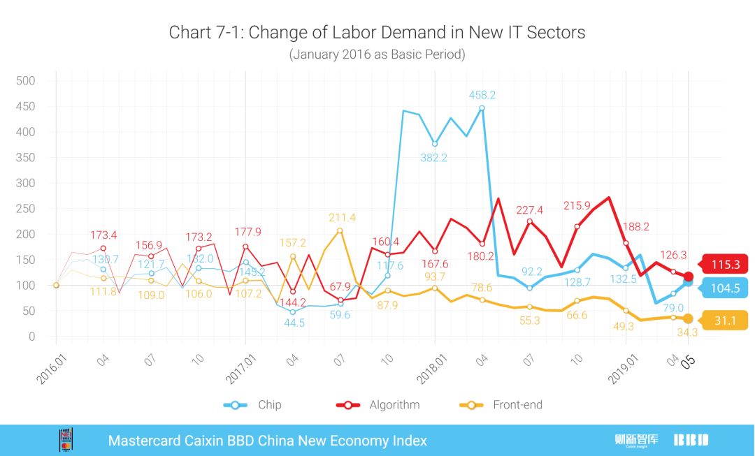 In May, we focused on labor demand in New IT sectors by exploring the employment and average salary of chip engineer, algorithm engineer and front-end engineer. It can be seen that the demand for chip engineer and algorithm engineer increased compared to the second half of 2017, while the demand for front-end engineer dropped significantly (Chart 7-1). After soaring at the end of 2017, the demand for chip engineer slumped but it was still higher than 2016. The rise of algorithm engineer was more stable and higher. In terms of average salary (Chart 7-2), the premium of chip engineer and algorithm engineer over front-end engineer increased as well. The salary of algorithmic engineer was no more than double the national average salary in 2016, and now it was nearly 2.5 times. The salary of chip engineer was almost twice that of the whole economy. The front-end engineer faced wage stagnation for their salary stayed at less than 1.5 times of the national average salary since 2016. These observations indicated the structural change of New IT industry: New IT industry started to move up the value chain by shifting from sales and service expansion.