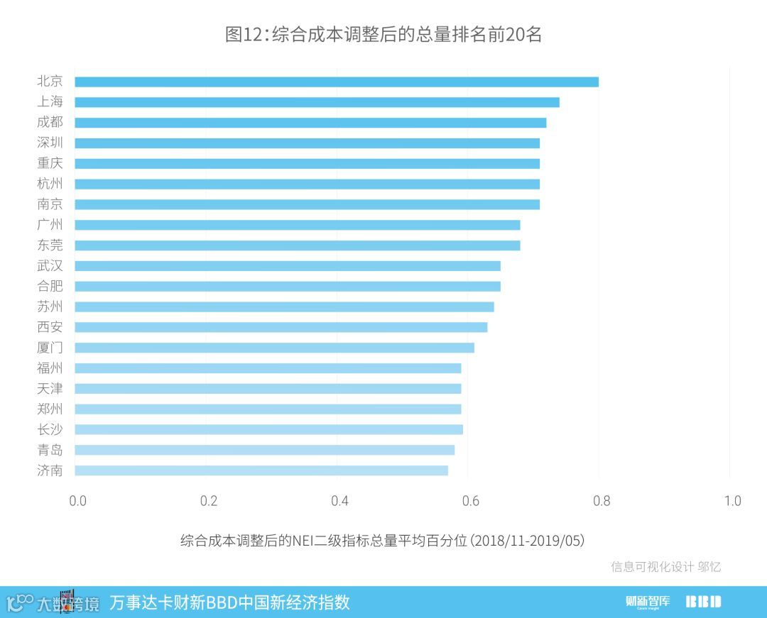 图11计算了2018年11月到2019年5月城市NEI平均排名,前五名为北京、杭州、厦门、合肥和苏州。