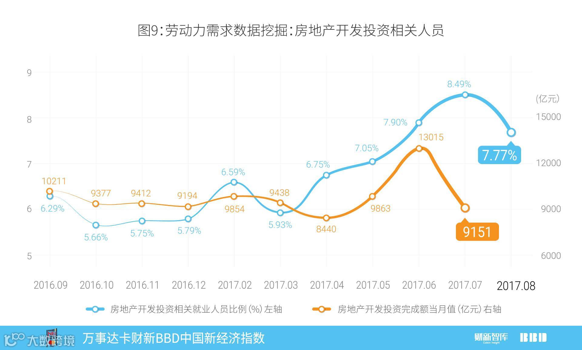 本月,我们继续使用劳动力大数据对目前的投资进行分析,使用中国每月的房地产开发投资完成额当月值与劳动力数据建筑类就业人员的需求占比进行比较。在2017年7月的建筑类就业相关人员预测与实际稍有偏差,但整体趋势印证相对准确性,7月的建筑类就业人员占比为8.49%,环比上升0.59%,同时7月的房地产投资完成额当月值为9151亿元,低于6月的13015.3亿元,环比下降29.7%(图9)。
