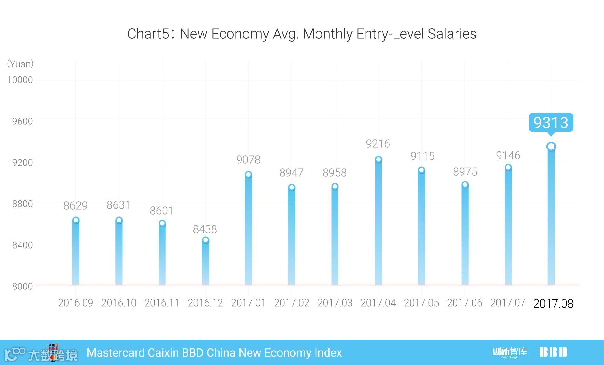 In August 2017, the average monthly entry level salary of the New Economy was RMB 9,313 per month, increasing from last month’s level of RMB 9,146 (Chart 5). New Economy wage information is compiled from online websites of career platforms and recruitment services including 51job and Zhaopin, as well as other sites that list job demands.