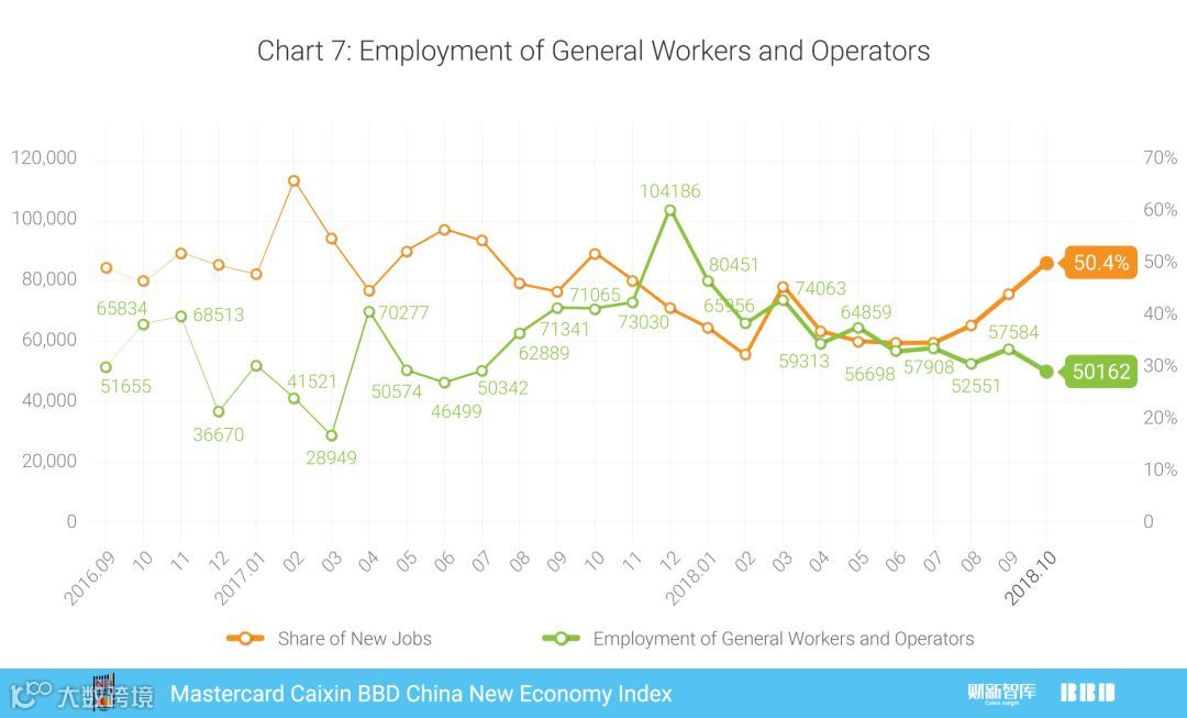 In October 2018, the average monthly entry-level salary of the New Economy was RMB 10,150, decreasing from last month’s level of RMB 10,161 (Chart 5). New Economy wage information is compiled from online websites of career platforms and recruitment services including 51job and Zhaopin, as well as other sites that list job openings.