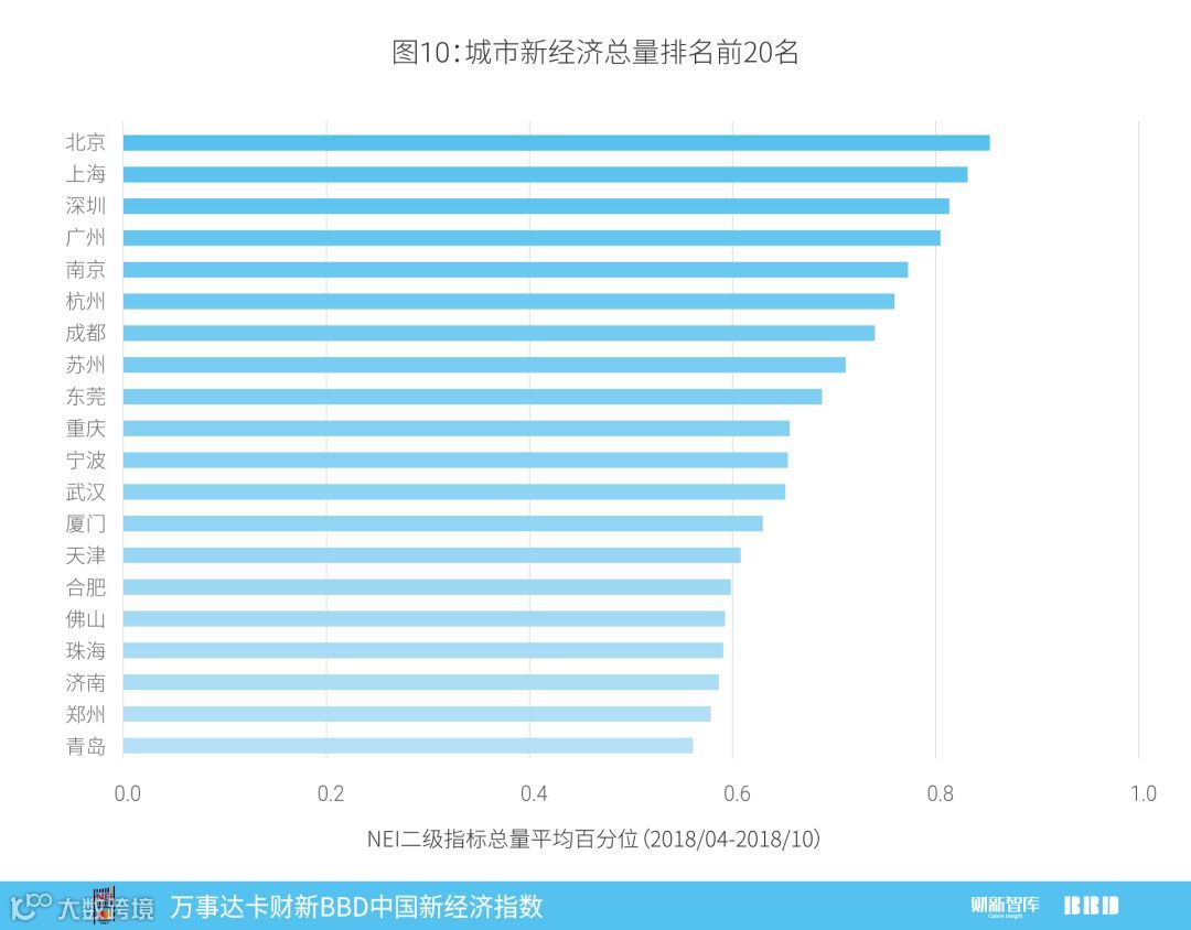 2018年10月新经济总量城市排名前20名如图10所示,北京、上海、深圳、广州和南京排名前五。该排序计算每个投入指标在所有城市中的排序百分位,再将百分位加权平均,体现的是近半年城市间新经济总量排名。