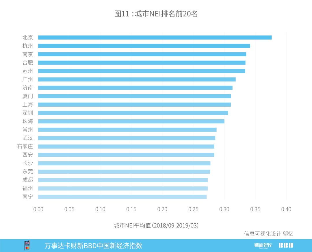 图11计算了2018年9月到2019年3月城市NEI平均排名,前五名为北京、杭州、南京、合肥和苏州。