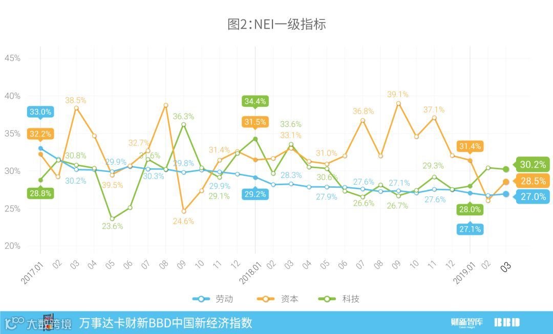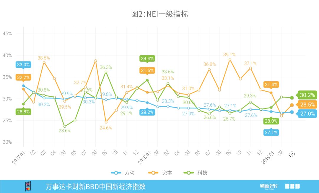 2019年3月,万事达卡财新BBD中国新经济指数(NEI)录得28.3,即新经济投入占整个经济投入的比重为28.3%。2017年以来,NEI指数波动较大,按可比口径计算,本月NEI比上月上升0.9个百分点(图1)。本月NEI的上升主要来自资本投入的上升。