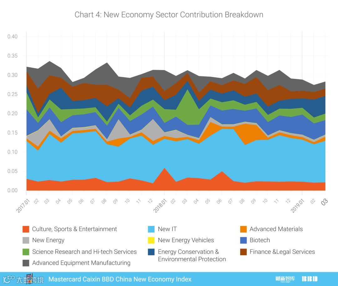 As for sectors, the rankings were the sameas previous month, with the New IT industry formed the largest proportion ofthe New Economy Index, contributing 11.0 ppts to NEI. New Energy Vehicles wasthe industry with the lowest ranking, only contributing 0.1 ppts this month(Chart 4).