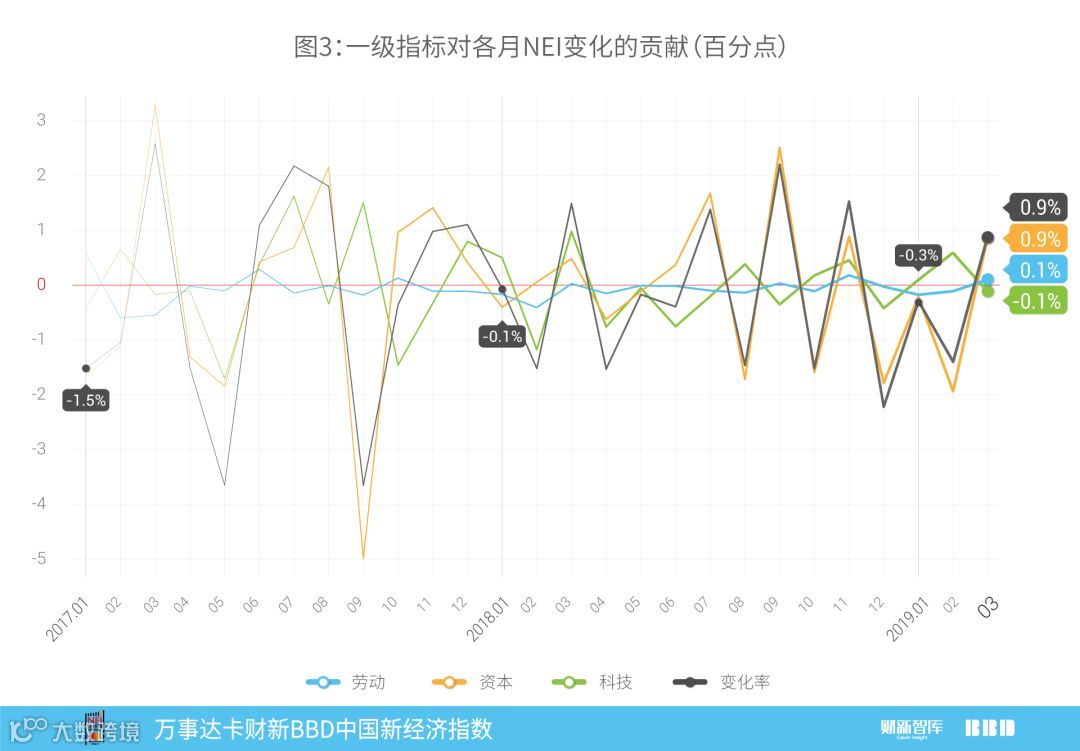 劳动力、资本和科技投入的变化百分比分别为0.1,0.9,和-0.1个百分点,与权重相乘求和后,对2019年3月NEI变化的贡献值为0.9%(图3)。