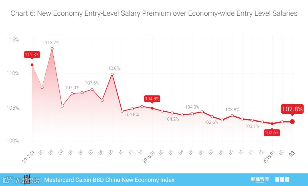 In March 2019, the average monthlyentry-level salary of the New Economy was RMB 10,533, decreasing from lastmonth’s level of RMB 10,627(Chart 5). New Economy wage information is compiled from online websites ofcareer platforms and recruitment services including 51job and Zhaopin, as wellas other sites that list job openings.