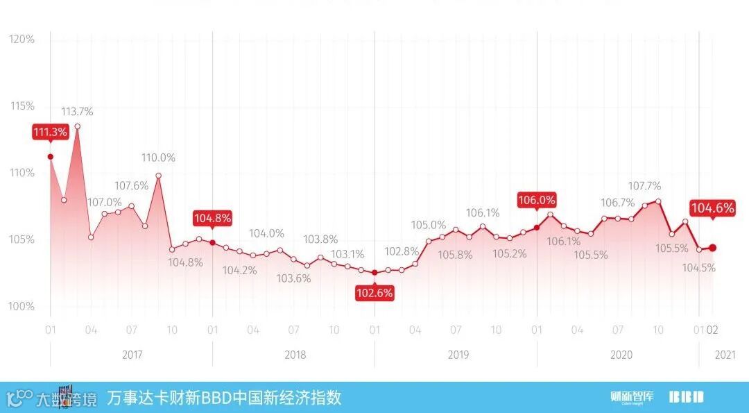2021年2月,新经济行业入职平均工资水平高出社会平均值4.6%,较上月微升
