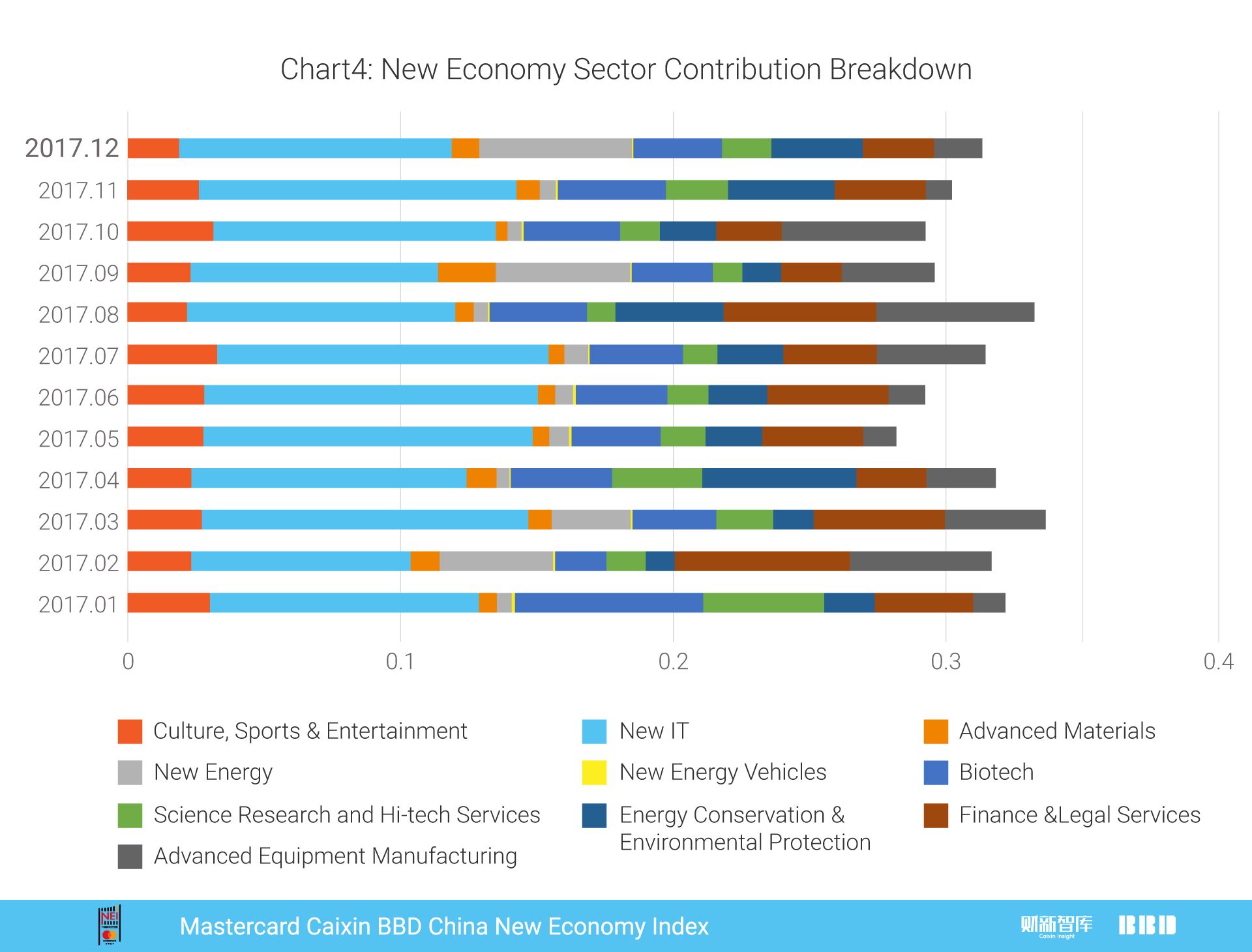 In December 2017, the Mastercard Caixin BBD New Economy Index (NEI) reading came in at 31.4, indicating that the New Economy accounted for 31.4% of overall economic input activities that month, up 1.1 ppts from November (Chart 1). The rising NEI was due to the increase of technology input. New economy is defined as following: 1) human capital intensive, technology intensive and capital light; 2) sustainable rapid growth, and 3) in line with the strategic new industries defined by the government. Please refer to our previous reports (March 2016 and March 2017) for the list of NEI sectors.