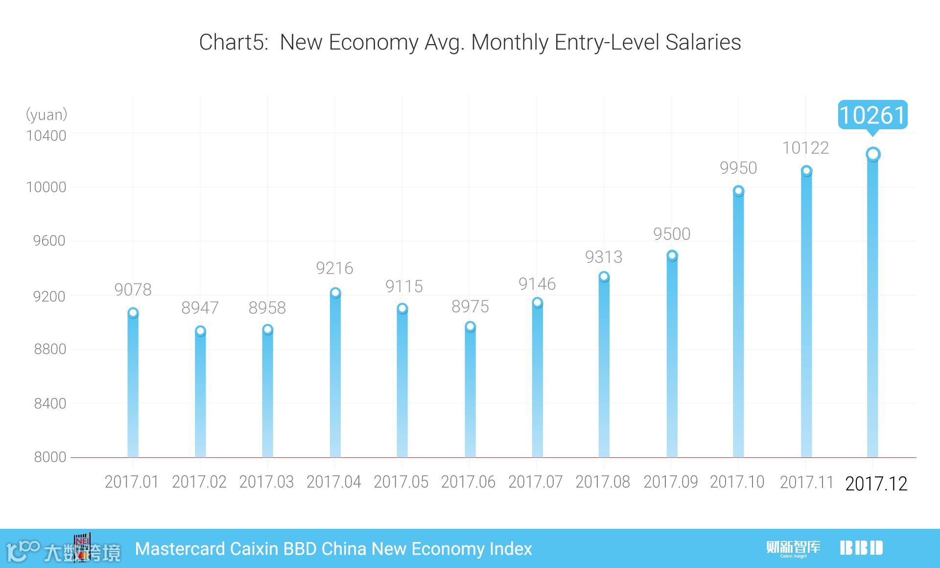 In December 2017, the average monthly entry level salary of the New Economy was RMB 10,261 per month, increasing from last month’s level of RMB 10,122 and reaching the highest level since 2016 (Chart 5). New Economy wage information is compiled from online websites of career platforms and recruitment services including 51job and Zhaopin, as well as other sites that list job demands.