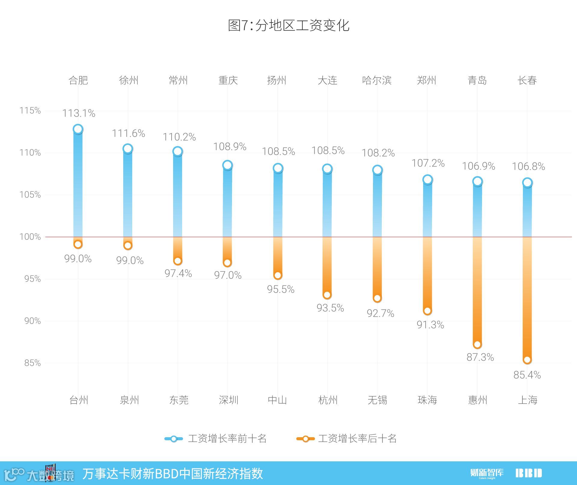而在工资增长最慢的城市中,上海独占鳌头,2017年新增就业的工资甚至低于2016年,惠州、珠海、无锡、杭州、中山等紧随其后。与工资增长最快的地区相比,工资增长最慢的地区集中于原本的沿海工业城市中。