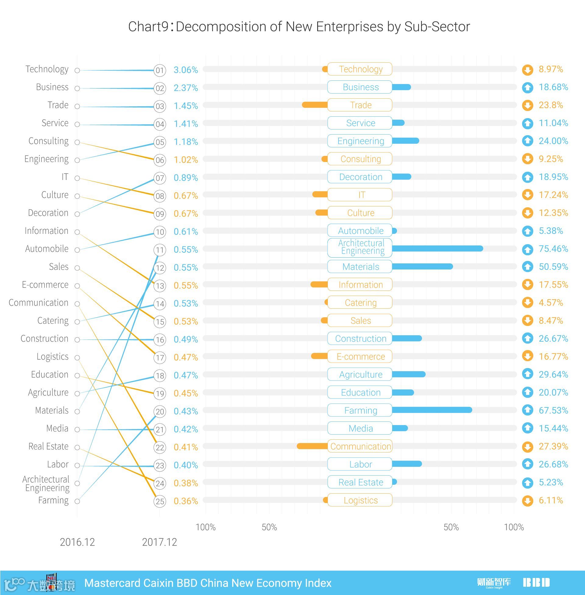 Ranking up sub-sectors (from December 2016 to December 2017) include the following. Architectural Engineering (No.24 to No.11, 75.5% increase in proportion, the fastest growth sector in terms of ranking in December), Meterials (No.20 to No.12, 50.6% increase in proportion), Farming (No.25 to No.20, 67.5% increase in proportion), Decoration (No.9 to No.7, 18.9% increase in proportion). In addition, Engineering, Automobile, Catering and Agriculture saw a ranking up as well.