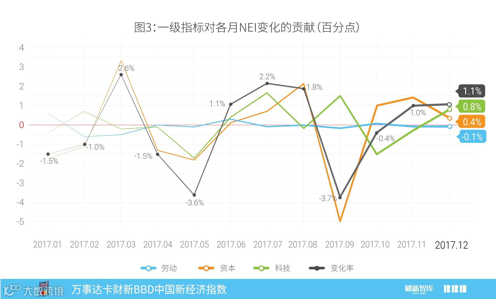 主要在科技投入增加的影响下,2017年12月万事达卡财新BBD中国新经济指数(NEI)出现回升。