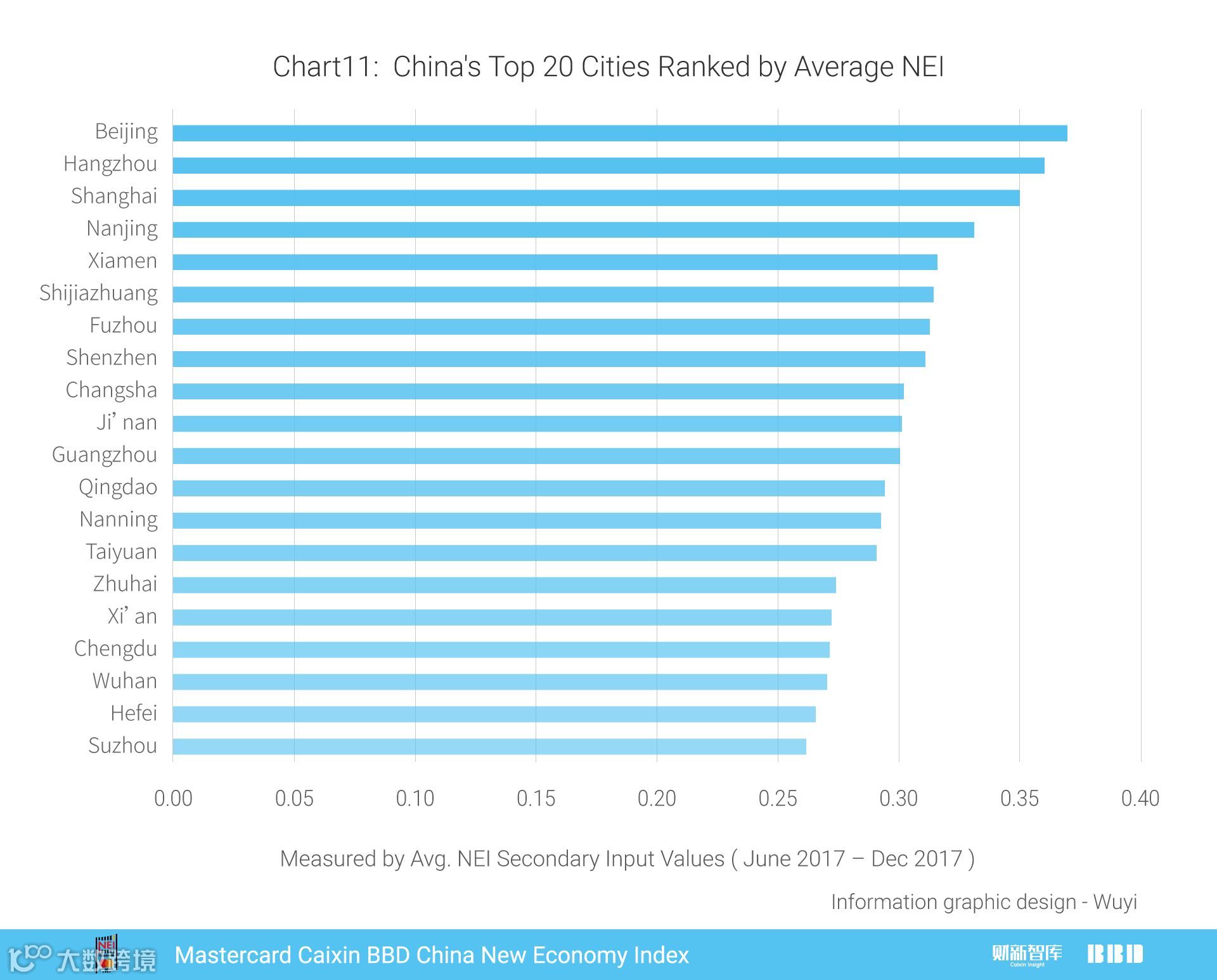 Chart 11 showed the average NEI city rankings between April 2017 and December 2017. The top five cities were Beijing, Hangzhou, Shanghai, Nanjing and Xiamen.