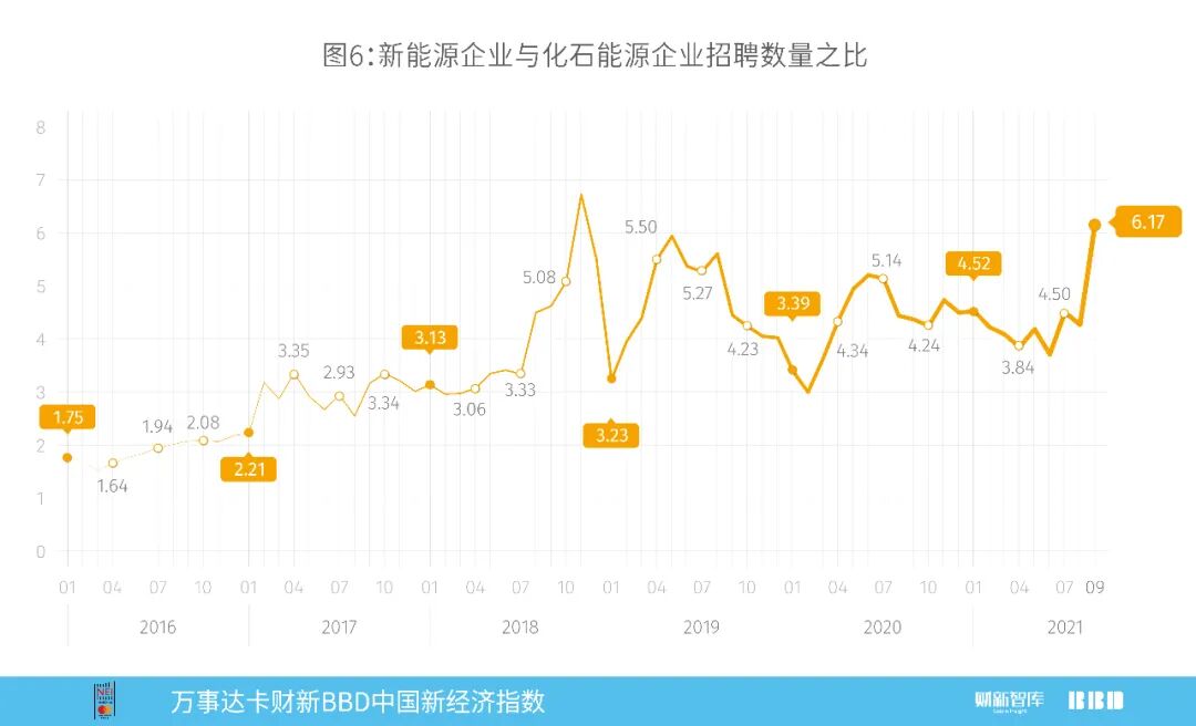 近些年,新能源企业招聘数量始终大于化石能源企业,在2021年9月达到化石能源企业的6倍以上。