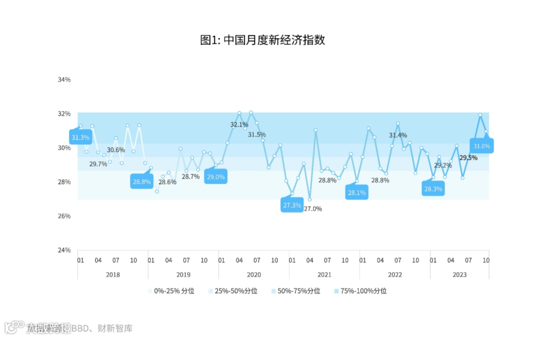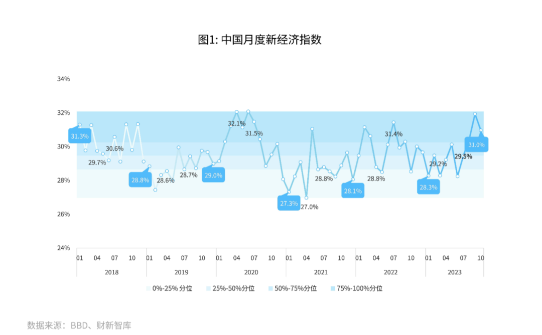 2023年10月,财新BBD中国新经济指数(NEI)录得31.0,较前月下降0.9个百分点