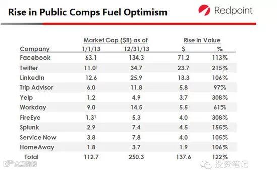 消费互联网企业的市值正在迅速走高。根据对谷歌、Twitter等30家上市公司的跟踪研究表明,消费互联网企业从08年的市值为平均预期收入的2倍,到2013年底增长至6.5倍。