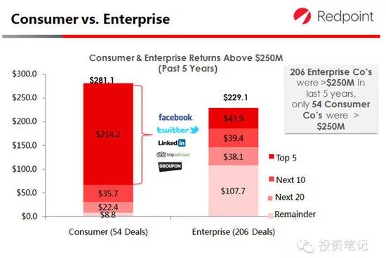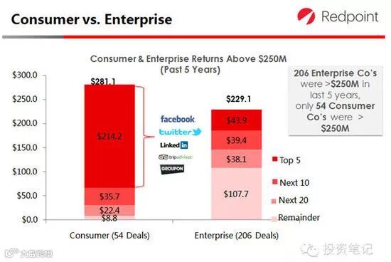 过 去5年有206家企业在美国上市时市值高于2.5亿美元,其中54家是消费互联网企业,IPO市值前五名Facebook,Twitter,Linkedin,Tripadviser和Groupon占到了总市值的76.2%,其余152家是企业级服务互联 网企业,其前五名IPO市值仅占总市值的19.2%。