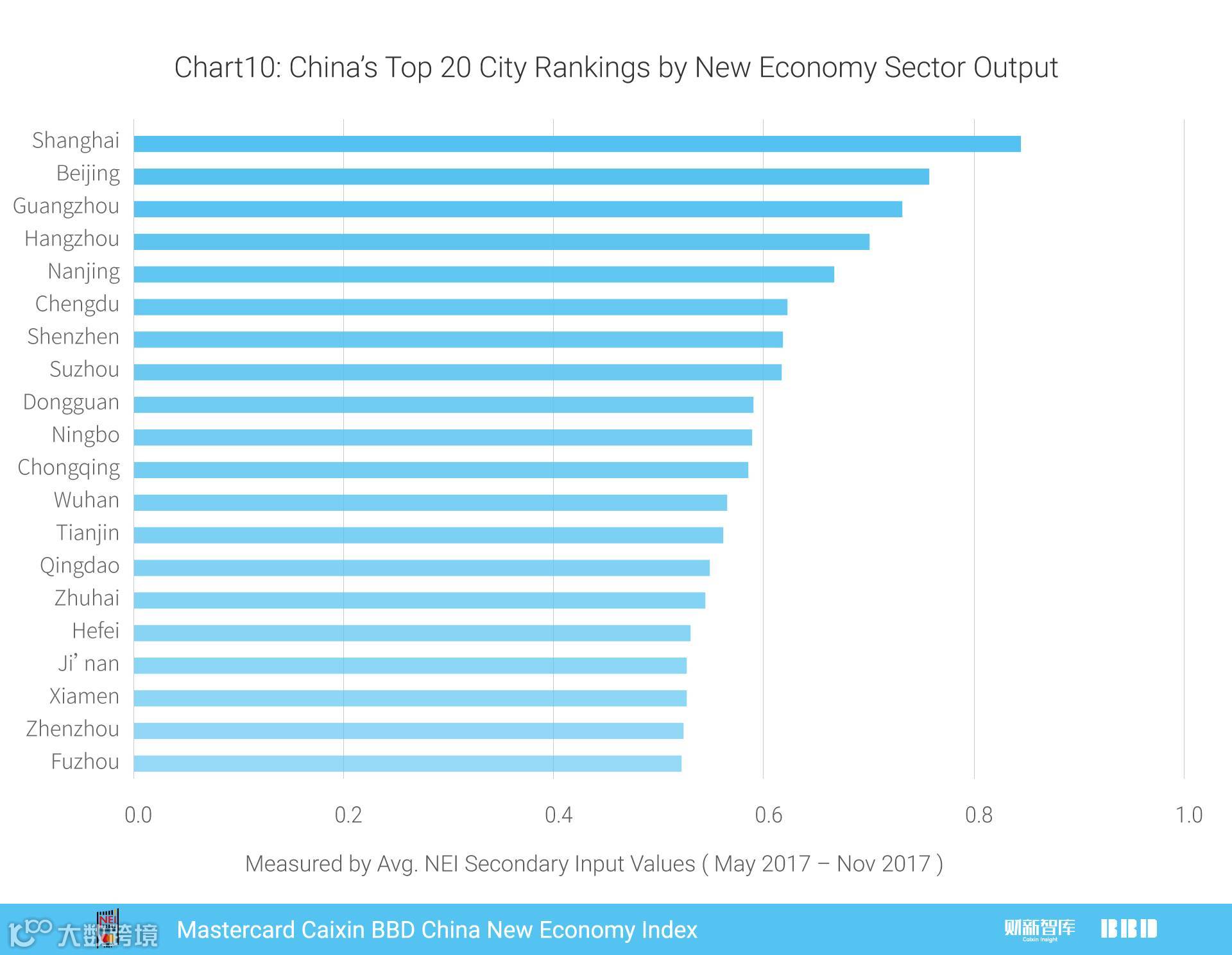 Based on overall New Economy rankings, the top twenty cities were shown in Chart 10. The top five cities were Shanghai, Beijing, Guangzhou, Hangzhou, and Nanjing. Rankings are based on a weighted average of the percentile rank of indicators for the city in the past 6 months.