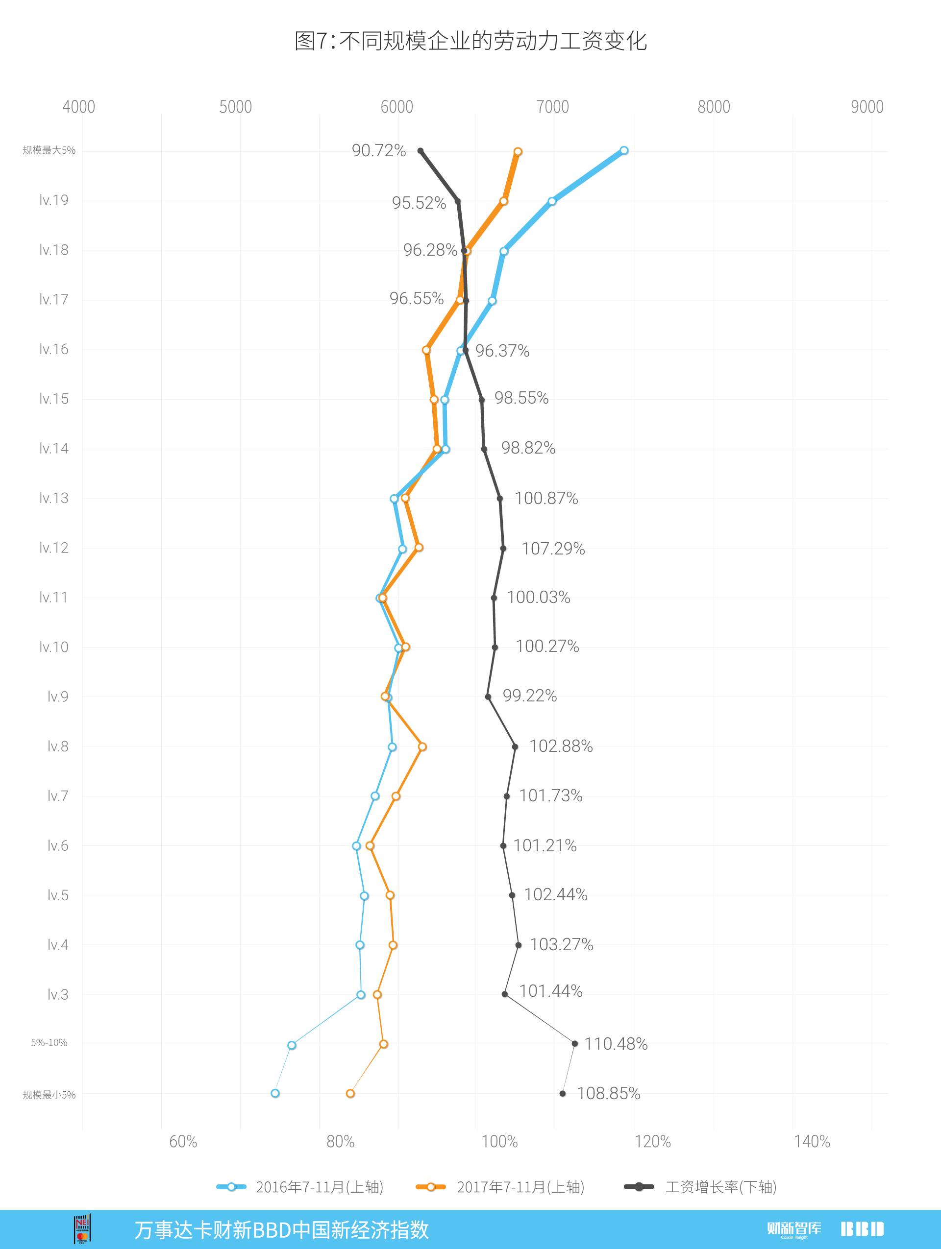 We further explored this in November. Chart 7 showed the comparison of average salaries across industrial enterprises. Compared to 2016, statistics showed that average salaries in small enterprises rose faster and average salaries in large companies were even declining by 9.9%. Average salaries in enterprises with different capital-to-labor ratios diverged. Industrial enterprises with light capital offered higher average salaries than capital intensive ones. If we divided all industrial enterprise into two halves by capital-to-labor ratio, the average salaries in capital light half were 7.4% higher than that of capital intensive half. But we did not observe similar pattern in terms of salary change from 2016 to 2017.