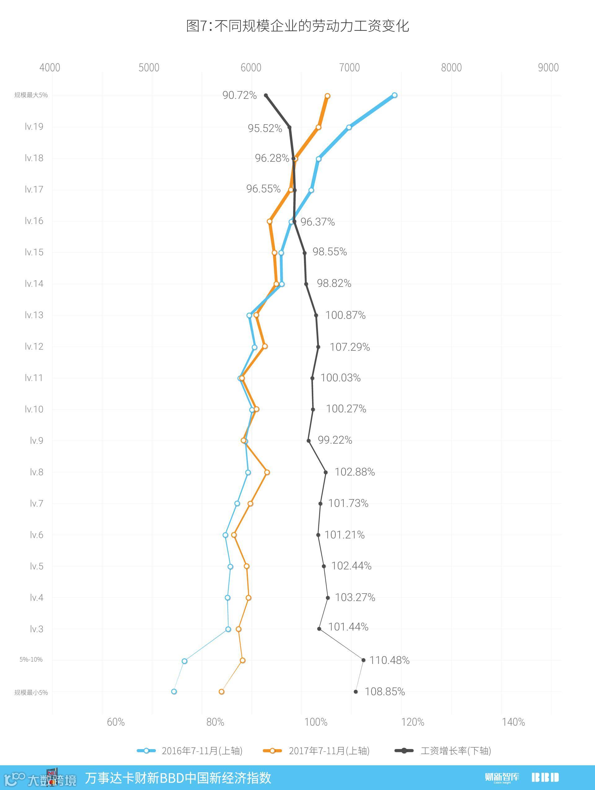2017年11月,新经济行业入职平均工资水平比上月有较大的提升,为每月10122元,较上月增长172元,达到有史以来最高值(图5)。新经济工资主要来自51job、智联招聘、拉钩、赶集网等数个招聘网站的招聘信息,即对劳动力的需求工资。