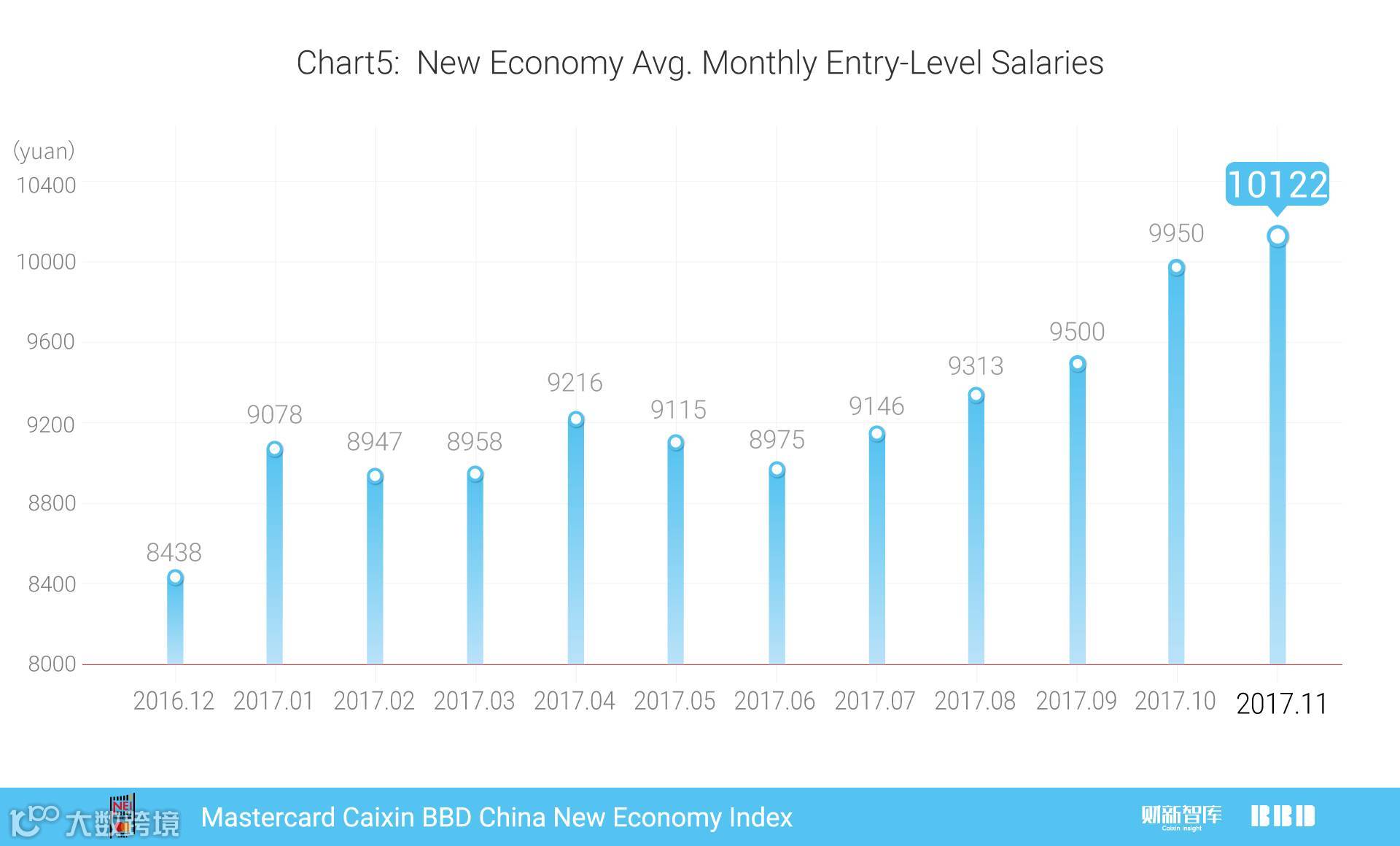 In November 2017, the average monthly entry level salary of the New Economy was RMB 10,122 per month, increasing from last month’s level of RMB 9,950 and reaching the highest level since 2016 (Chart 5). New Economy wage information is compiled from online websites of career platforms and recruitment services including 51job and Zhaopin, as well as other sites that list job demands.