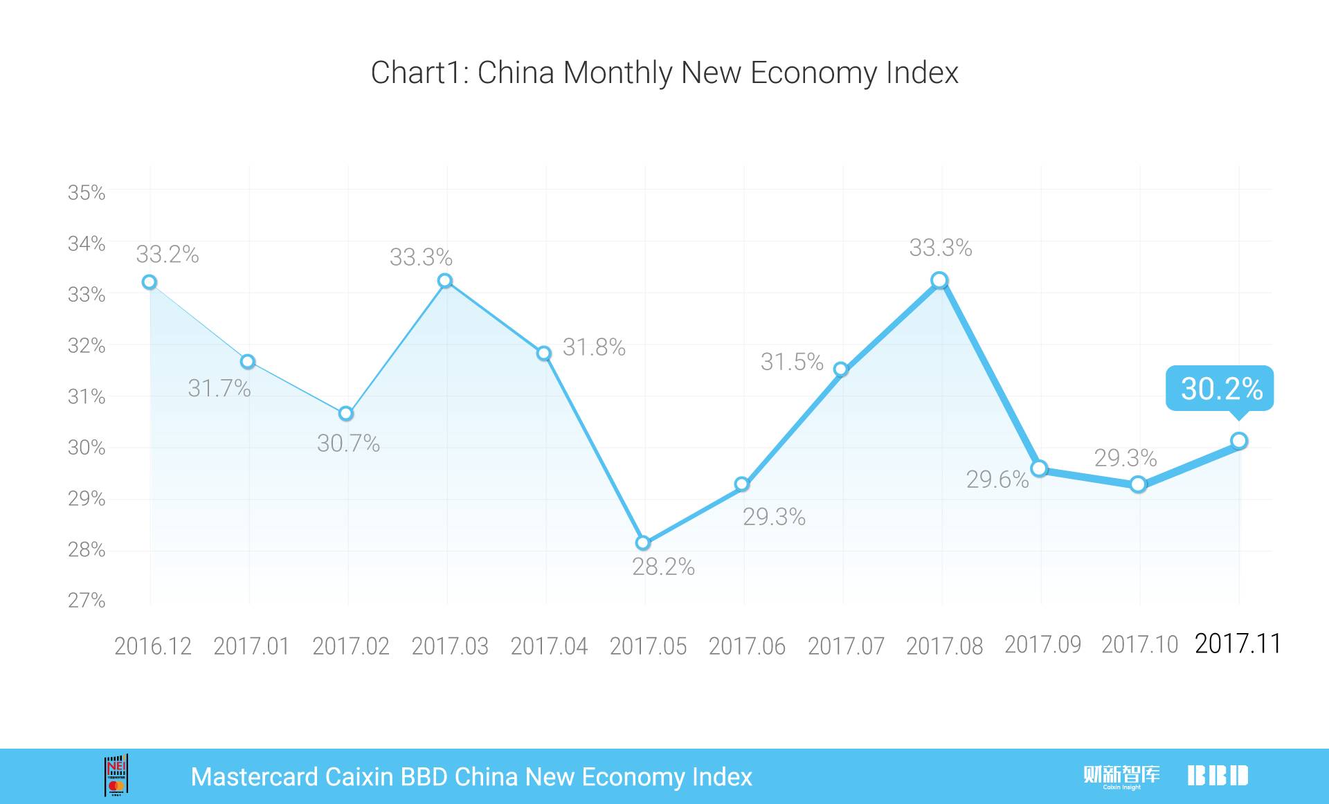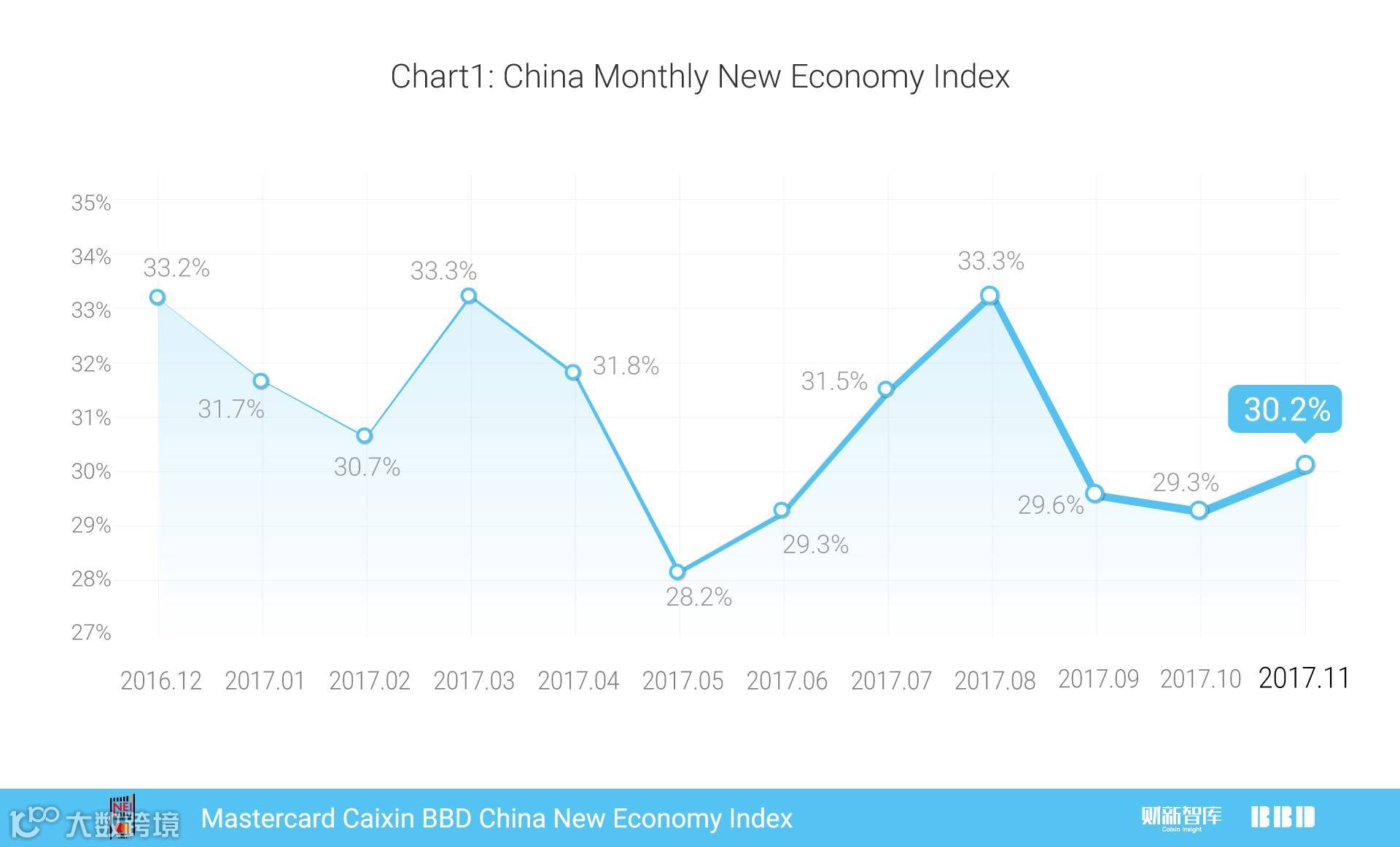 12月2日,财新智库和BBD联合发布数据显示,11月,万事达卡财新BBD中国新经济指数(NEI)录得30.2,即新经济投入占整个经济投入的比重为30.2%。