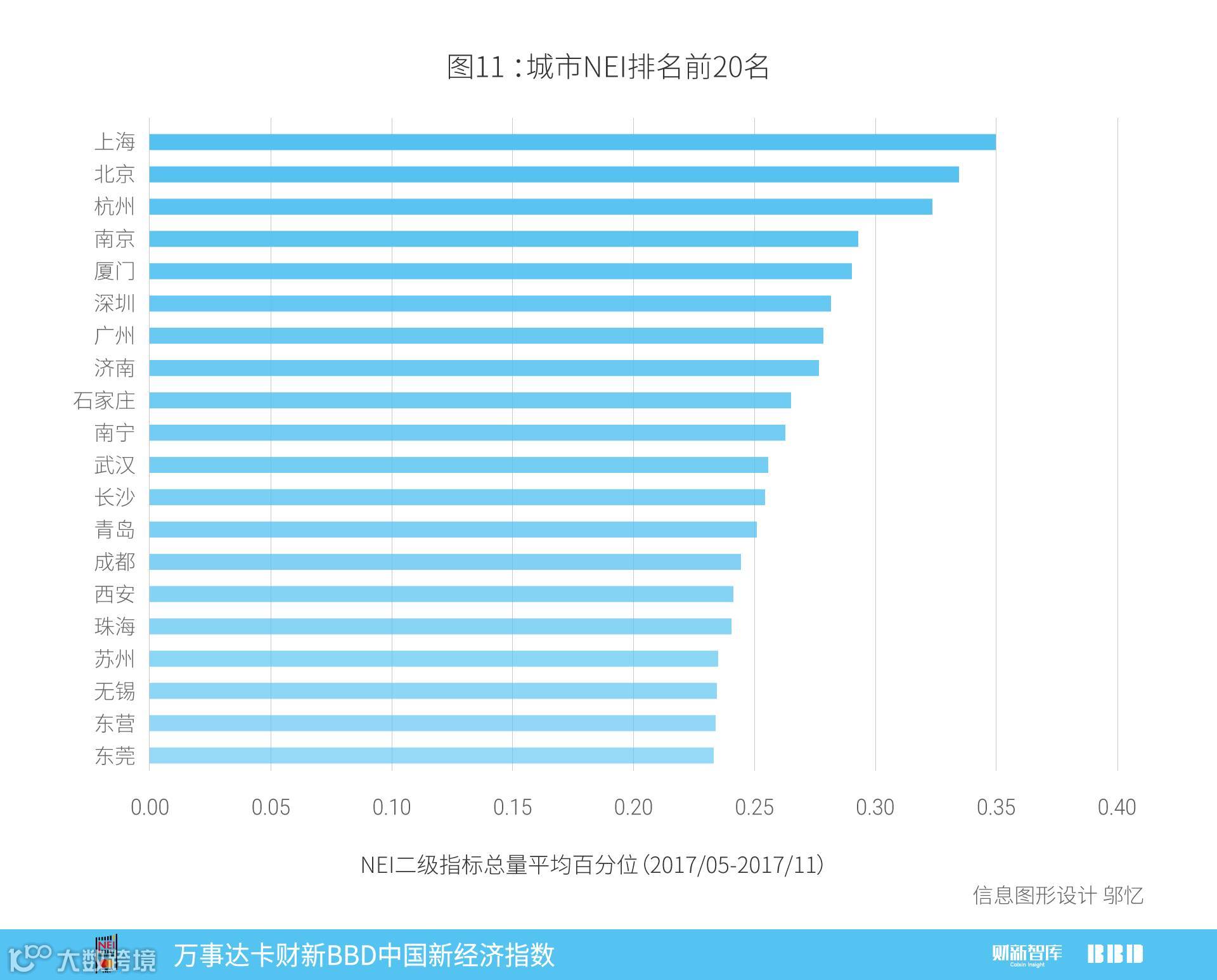 图11计算了2017年4月到2017年11月城市NEI平均排名,前五名为上海、北京、杭州、南京、厦门。