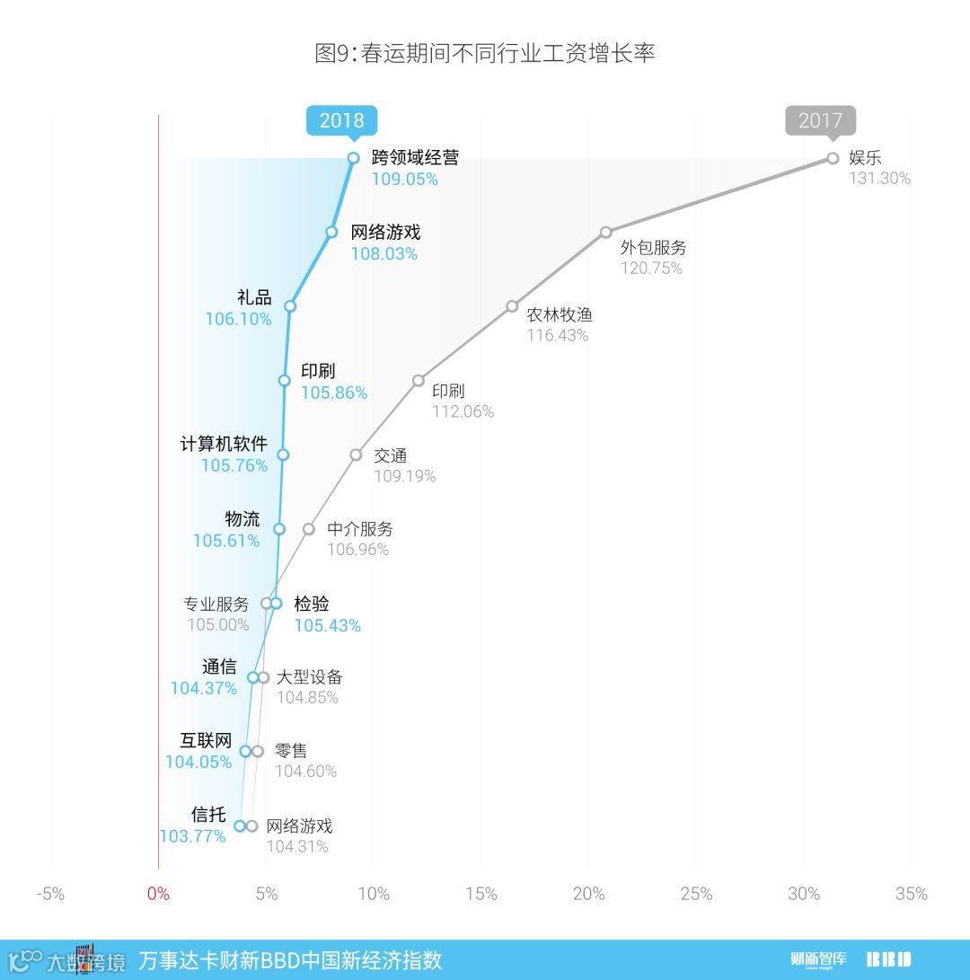 图9用类似的算法计算了不同行业的“春运工资溢价”,与城市的情况类似,不同行业的“春运工资溢价”也出现了下降。在2017年,一些行业接近春节时的工资涨幅达到了20%甚至30%,而在2018年,这些行业工资涨幅不再明显。两年的“春运工资溢价”前十名行业相比,仅有印刷和网络游戏两个行业连续处于前十名。