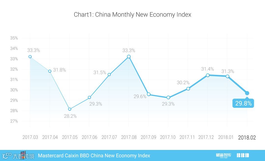 3月2日,财新智库莫尼塔和BBD联合发布数据显示,2月,万事达卡财新BBD中国的新经济指数(NEI)为28.3,即新经济投入占整个经济投入的比重为28.3%。该值较2018年1月的28.7继续下降0.4个百分点,是新经济指数公布以来的最低值。