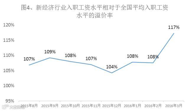 2016年3月,新经济行业入职工资水平持续上升,达到了8920元每月,显著高于2月前 7200-7500元的水平(图3)。新经济工资主要来自应届生、51job以及智联招聘等数个招聘网站的招聘信息,即对劳动力的需求工资。由于存在着较大比例的面议,且薪酬较高的工种面议的可能性更大,新经济平均入职工资可能反映的是实际工资水平的下限。