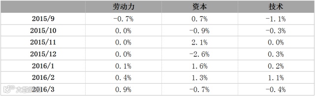 劳动力、资本和科技投入对3月NEI变化的绝对贡献值分别为0.9%,-0.7%,-0.4%(表2)。同时我们可以看到,劳动力和科技投入对NEI的贡献在最近半年内大多数为正值,而资本投入的贡献在月度间波动较大。