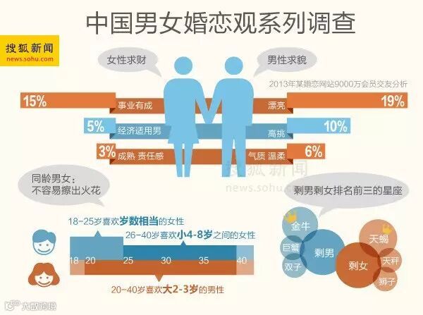 《中国男女婚恋观系列调查》之婚恋“大”数据的报告。报告对9000万单身会员在2013年的交友行为进行总结分析,“漂亮”、“事业有成”抢占会员搜索排行第一名,显示“男性求貌”、“女性求财”成为当前网络交友关注的热点。