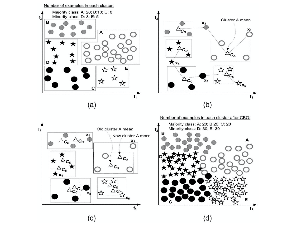 该领域较多被使用和讨论的有CBO(Cluster-Based Oversampling)算法。先利用K-means算法对同类样本聚类,然后根据包括类内和类间的不平衡比例计算每一类需要过采样的样本数量。如上图所示,原始样本如图(a),经过如图(b)和(c)所示的K-means动态聚类过程,最终对样本量相对较少的所有类进行过采样,最终实现如图(d)所示的样本,类间和类内样本数量均平衡。此外,还有DBSMOTE、Class Purity Maximizatio、Sampling-Based Clustering、the agglomerative Hierarchical Clustering等算法被提出和使用。