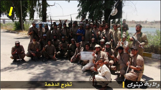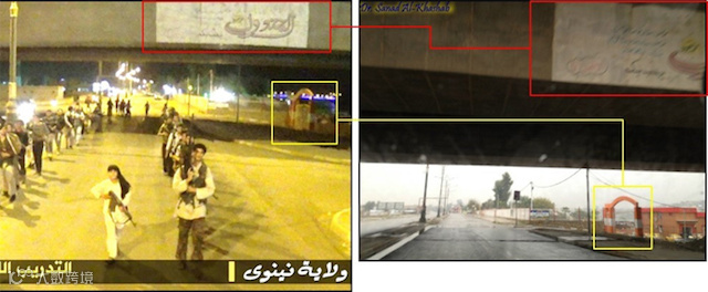 首先,看到了一张 ISIS 新兵训练营的毕业集体照。照片显示拍摄地点是伊拉克北部的尼尼微省。艾略特·希金斯发现照片后方有一座桥梁。