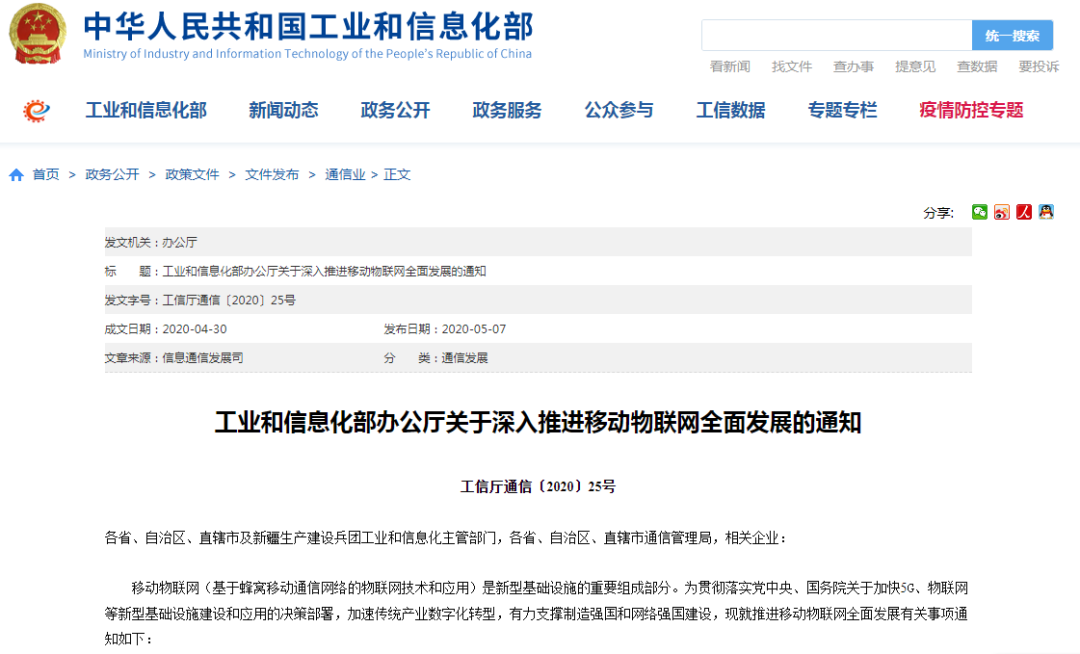 5月7日,国家工业和信息化部办公厅发布了一篇关于深入推进移动物联网全面发展的通知。